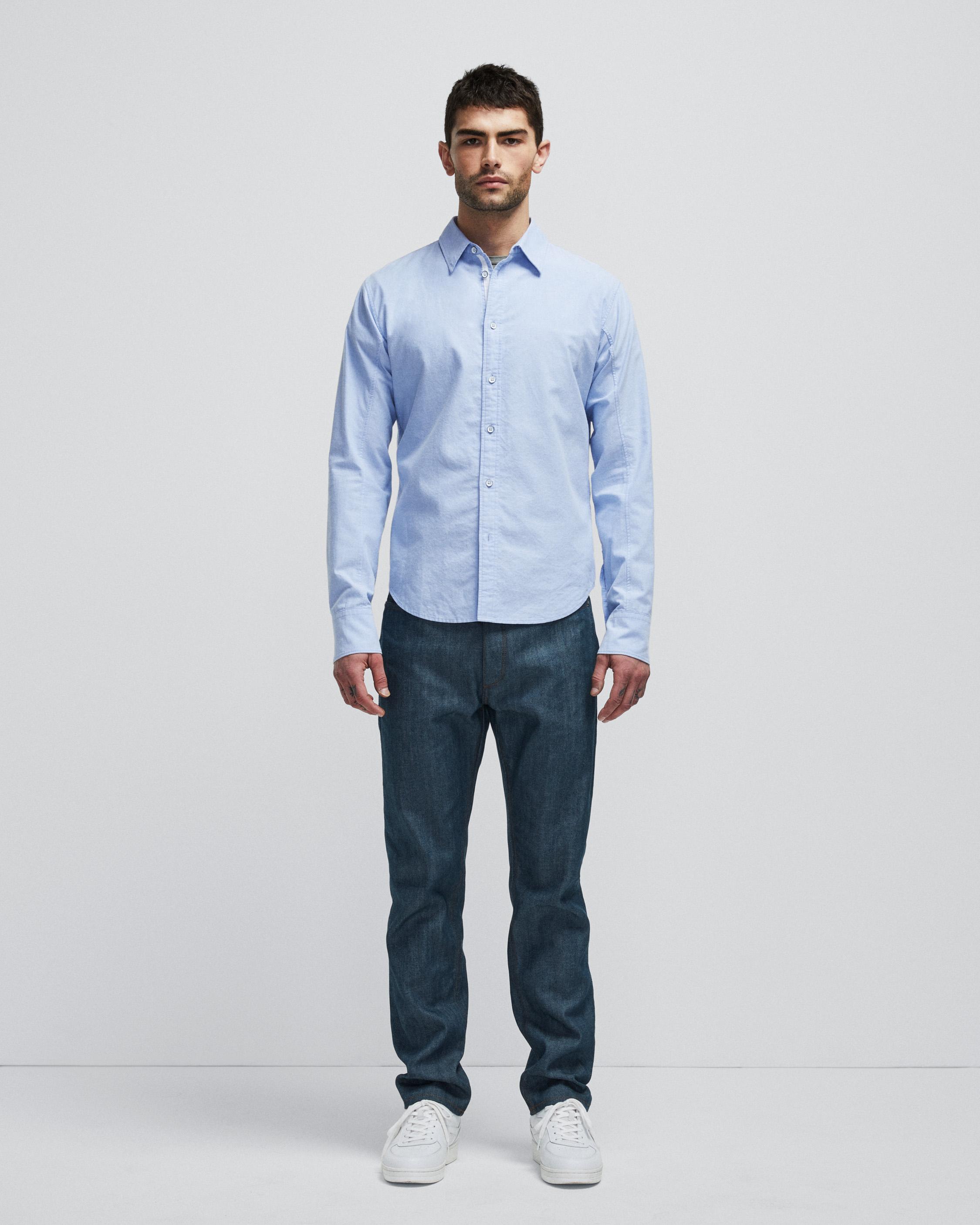 Machine washable Cotton yarn dye oxford shirting, cotton combo at internal back yoke and cuffs, side tab embroidery in ivory, 20l metal buttons down center front Rag & Bone buttons at sleeve plackets Quality guaranteed label at center front placket, icons hangag Imported Product ID: MBW23SA422X2ML |